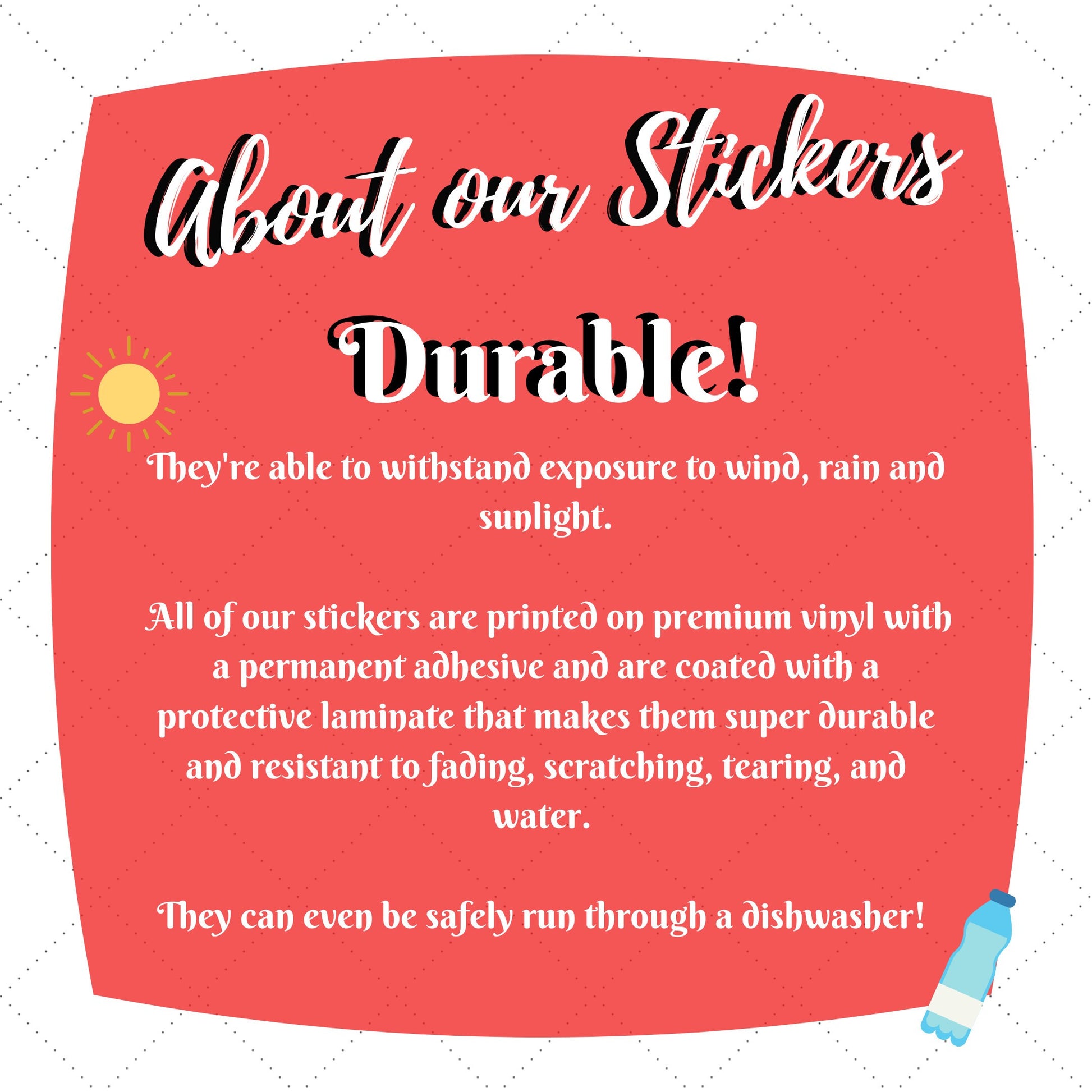 💪🏼 Durability: Stickers are waterproof and able to withstand exposure to wind, rain and sunlight. They are resistant to fading, scratching, tearing, and water; and are even dishwasher safe! Made with high quality vinyl and adhesive, so your stickers stay strong and stay put!