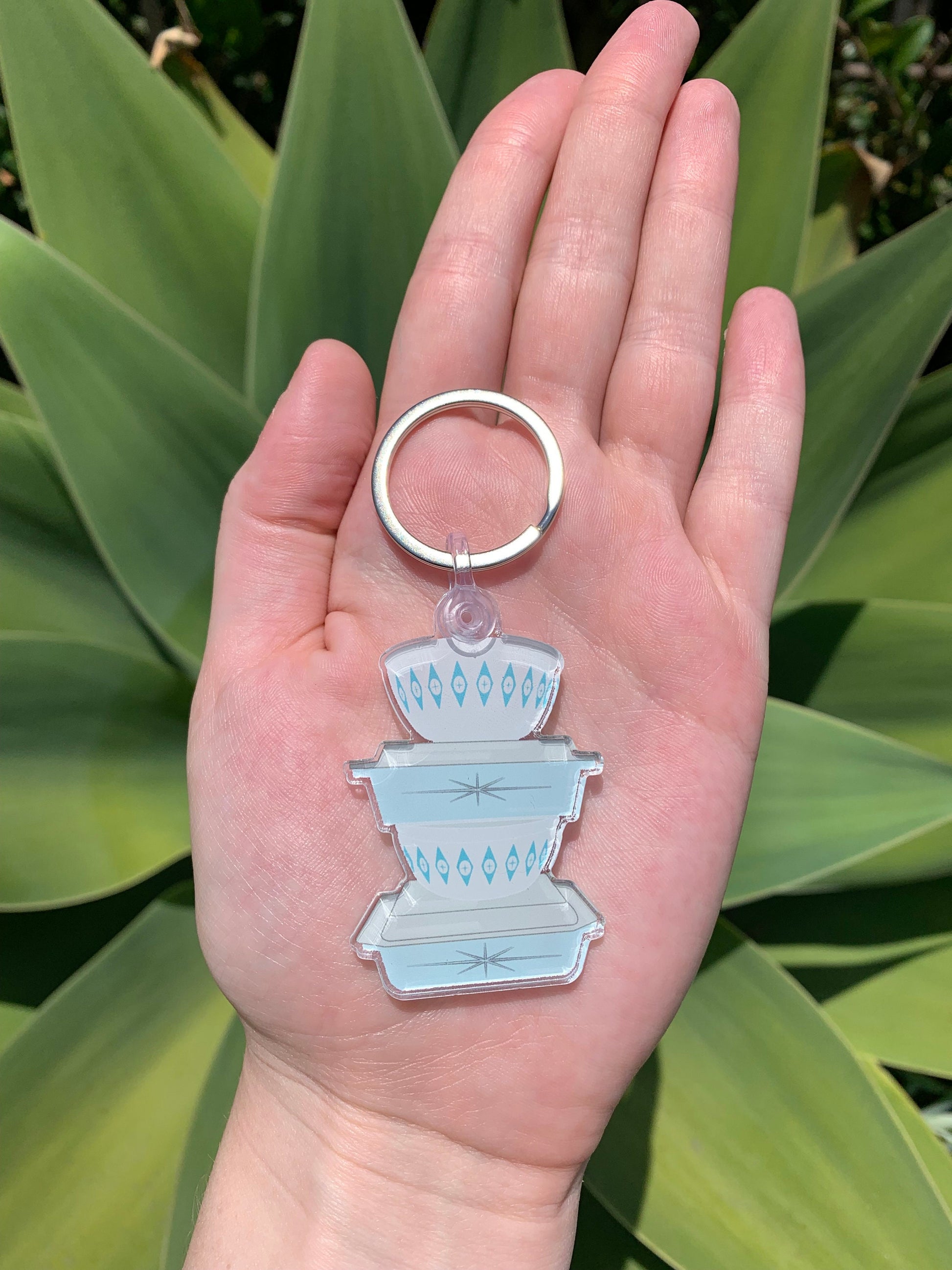 Vintage Pyrex Dishes Keychain - Light Blue Atomic Pattern
