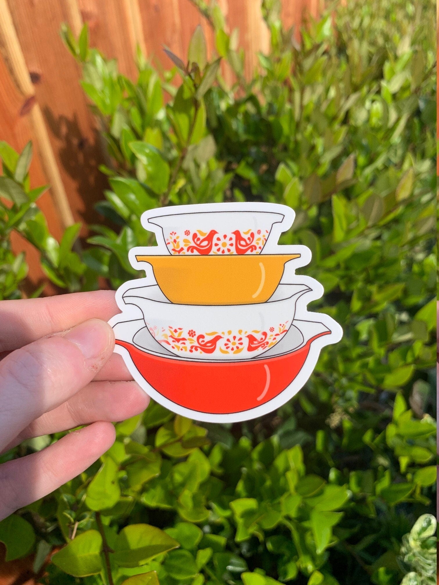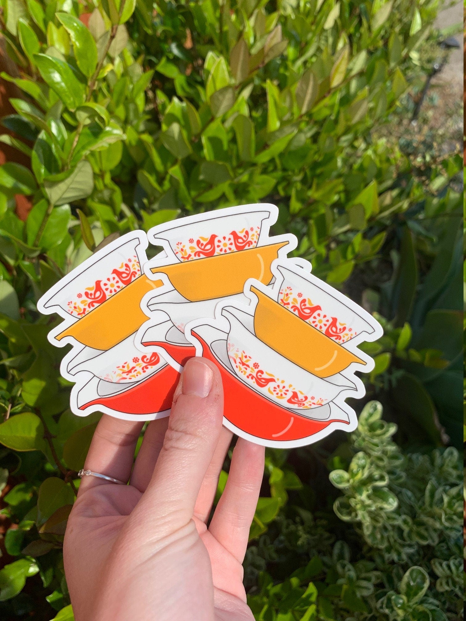 Custom designed vintage Orange and Red Pyrex Friendship Pattern Cinderella bowl set sticker! These durable stickers are great for the outdoors or indoors, they are fun, flexible, and vibrant. A great addition to any laptop, water bottle, or camper! If you are an antique loving woman or a glamping gal, these stickers bring the fun of vintage pyrex wherever you go!