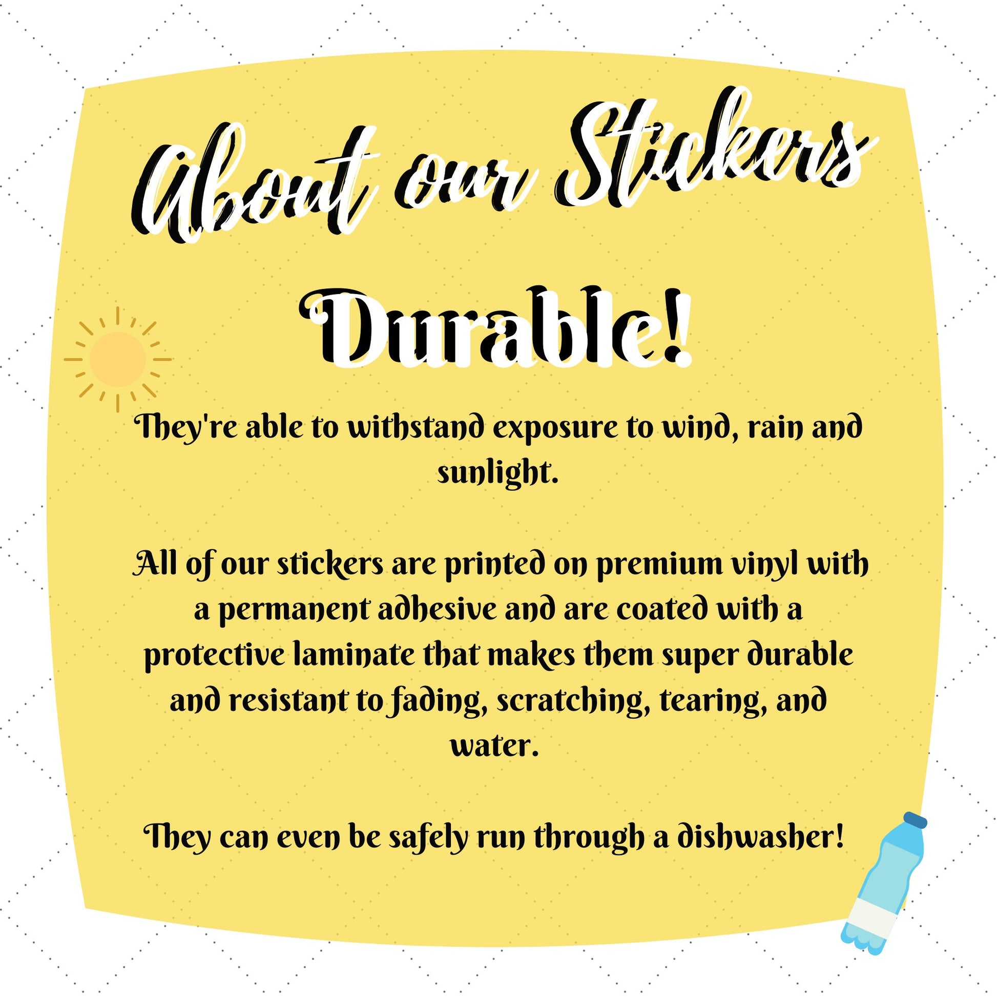 Durability: Stickers are able to withstand exposure to wind, rain and sunlight. They are resistant to fading, scratching, tearing, and water; and are even dishwasher safe!