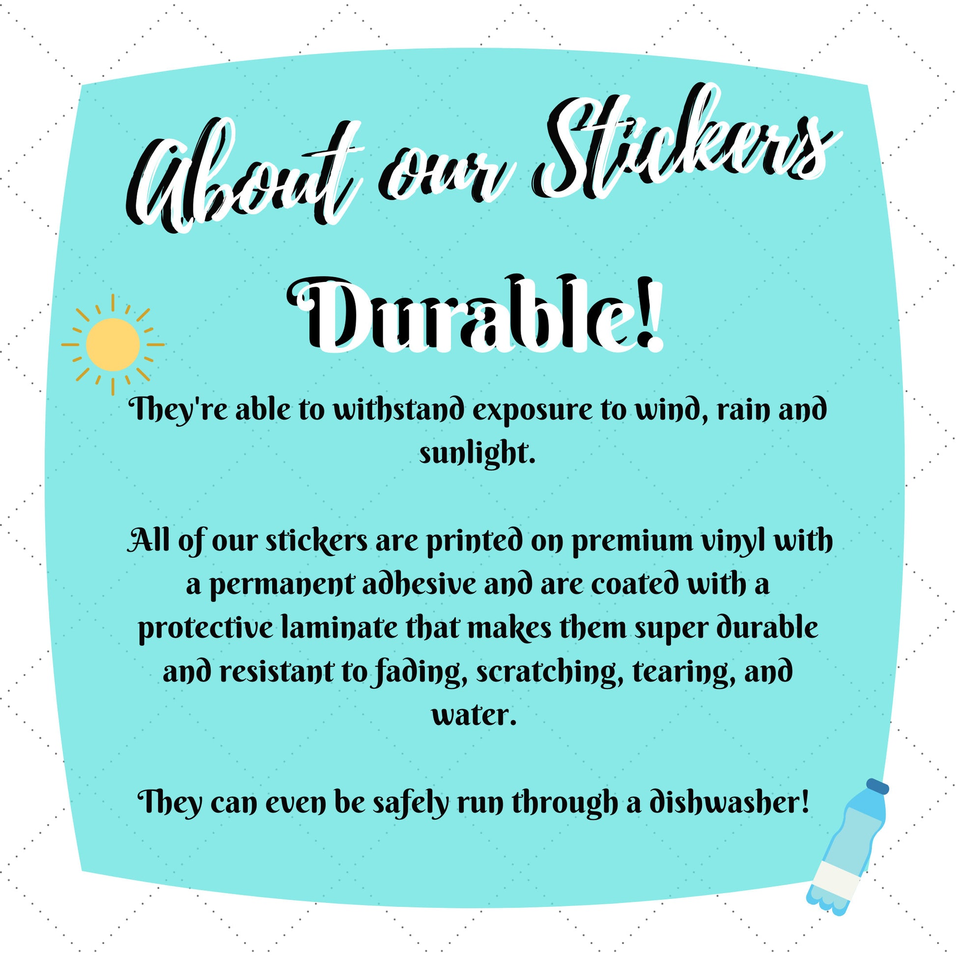 💪🏼 Durability: Stickers are weatherproof and able to withstand exposure to wind, rain and sunlight. They are resistant to fading, scratching, tearing, and water; and are even dishwasher safe! Made with high quality vinyl and adhesive, so your stickers stay strong and stay put!